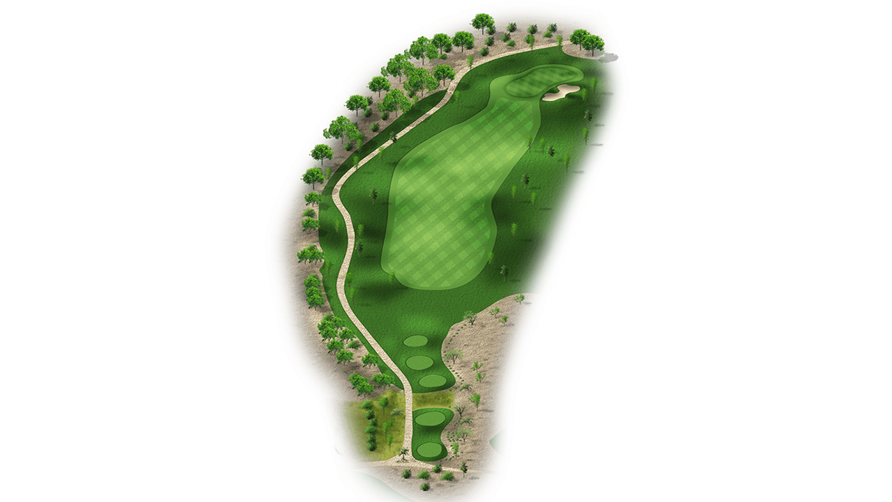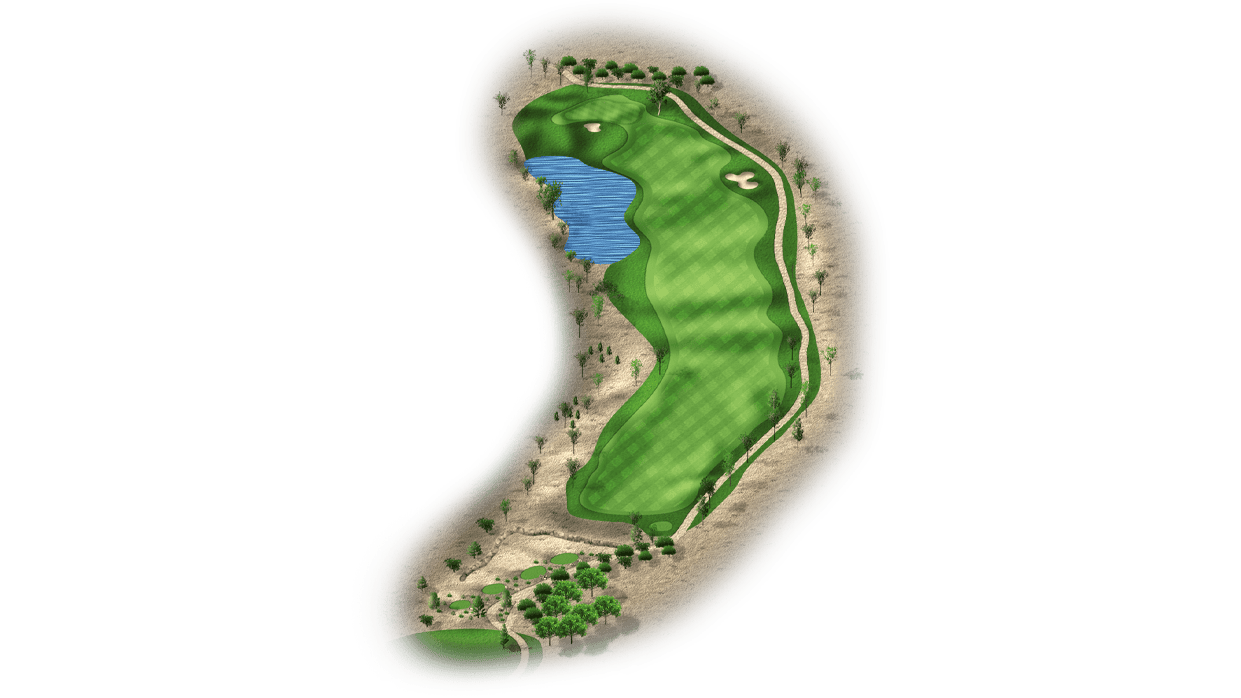 | This risk-reward hole is a drivable par 4 that’s protected by water on the right side. Players who lay-up will have a wedge into the green and will only have to avoid the bunker on the left side of the fairway. The green itself is also protected by bunkers on the right side. |