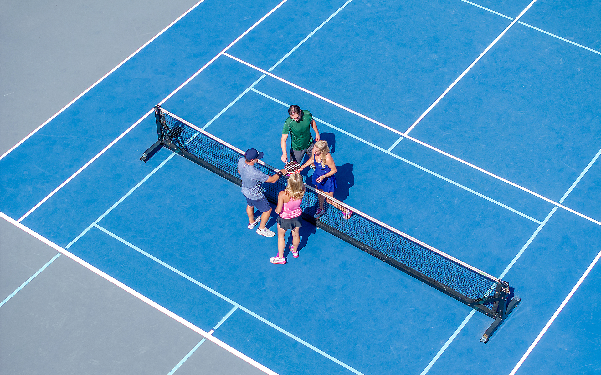 Four premium blended pickleball courts await players of all levels. Join a clinic, compete in tournaments, or enjoy the social spirit of the game.